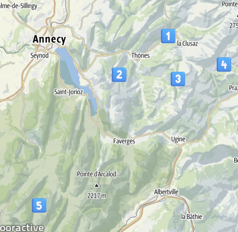 1️⃣Le Suet (860m / 27%) / 2️⃣Talamarche (1'056m / 24%) / 3️⃣KMV de Manigod (970m / 32%) / 4️⃣Le Croisse Baulet (1'012m / 24%) / 5️⃣La Croix de Rossanaz (955m / 27%)